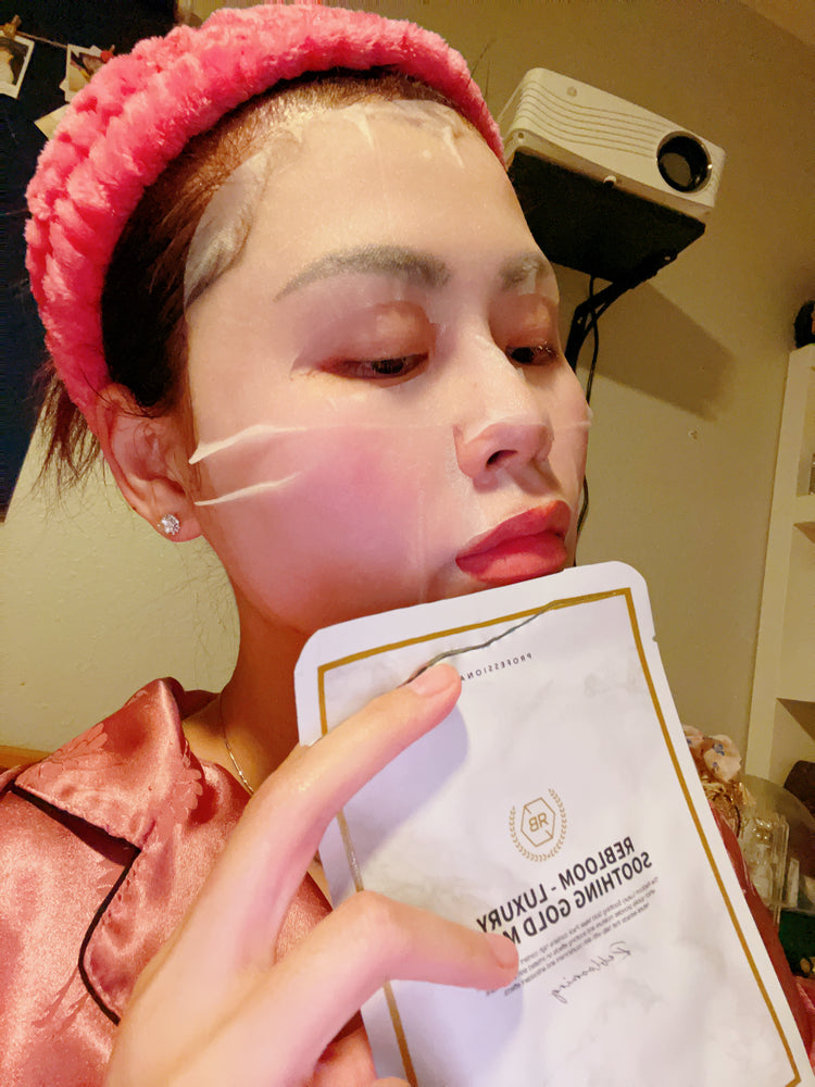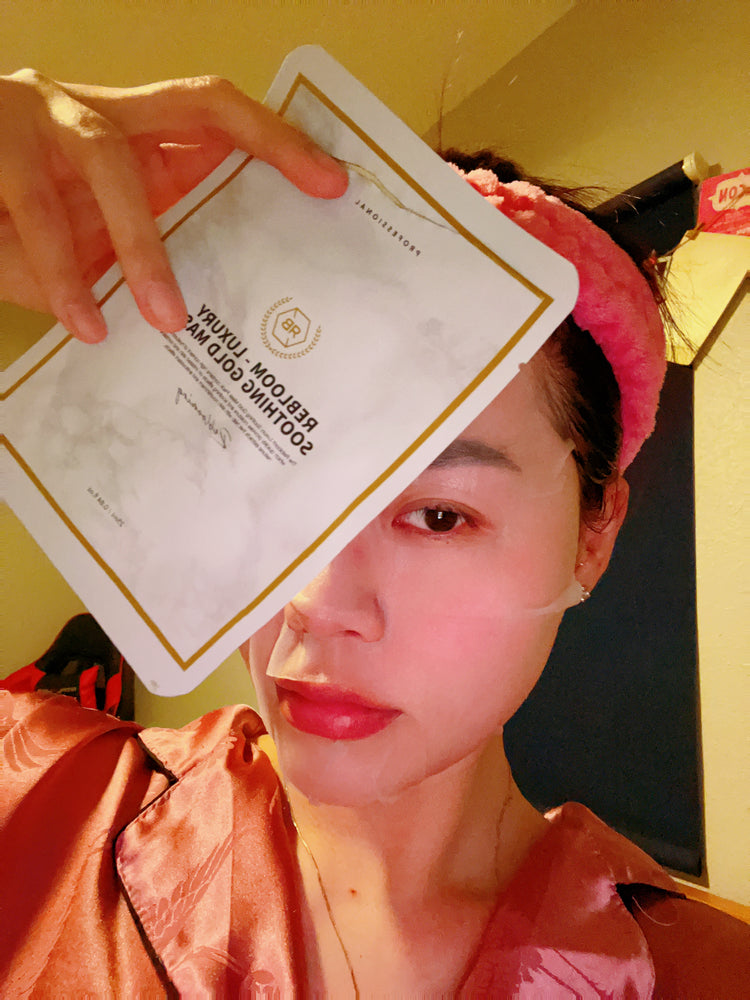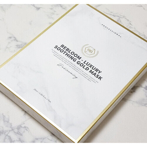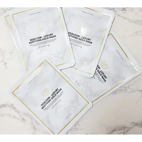 The Rebloom Luxury Soothing Gold Mask Pack contains high content of hyaluronic acid, which quickly provides moisture and soothing effects on irritated skin and contains natural extracts that help with skin nourishment and antioxidant effects. it also contains Human Umbilical Mesenchymal Stem Cell, which helps to produce protein reduced by aging within the skin and contains fermentation filtration and pepta7 complex to help improve skin elasticity and skin texture.