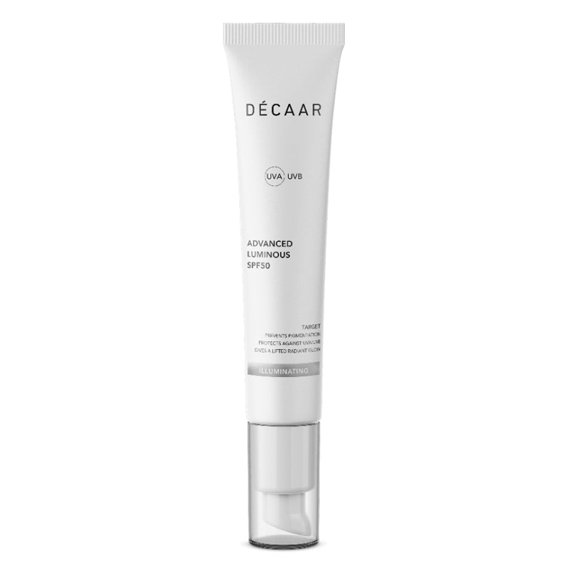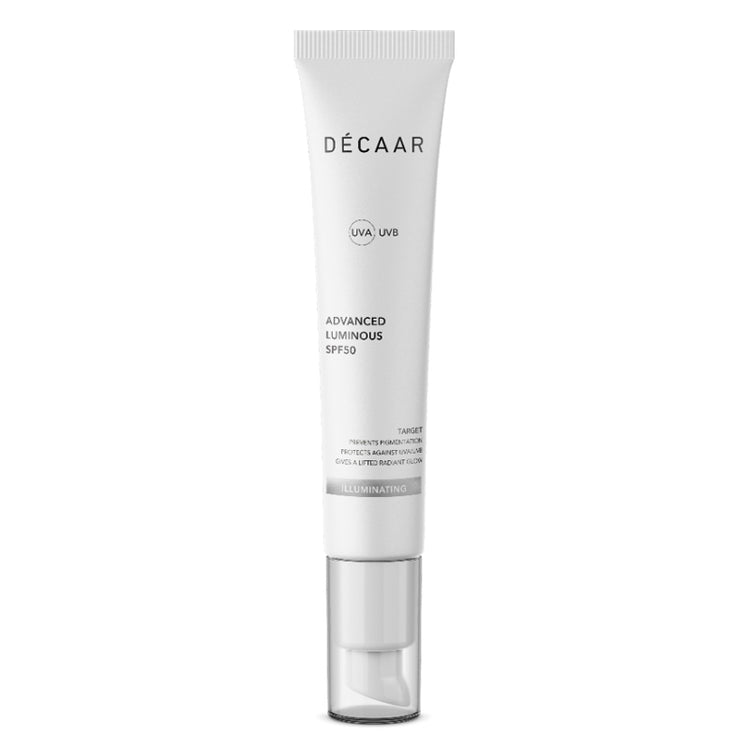 Kem chống nắng Décaar Advanced Luminous SPF 50 siêu nhẹ, dành cho cả da nhạy cảm và da dễ bị kích ứng. Với thành phần không chỉ có tác dụng chống nắng đơn thuần với chỉ số SPF phổ rộng, có màng lọc UVA, UVB, kem còn có tác dụng dưỡng da với các hoạt chất đặc biệt để ức chế hình thành melanin, ngăn ngừa các hoạt động tạo ra các vết thâm nám, da xỉn màu, làm trắng da đồng thời cấp ẩm, làm mềm da.